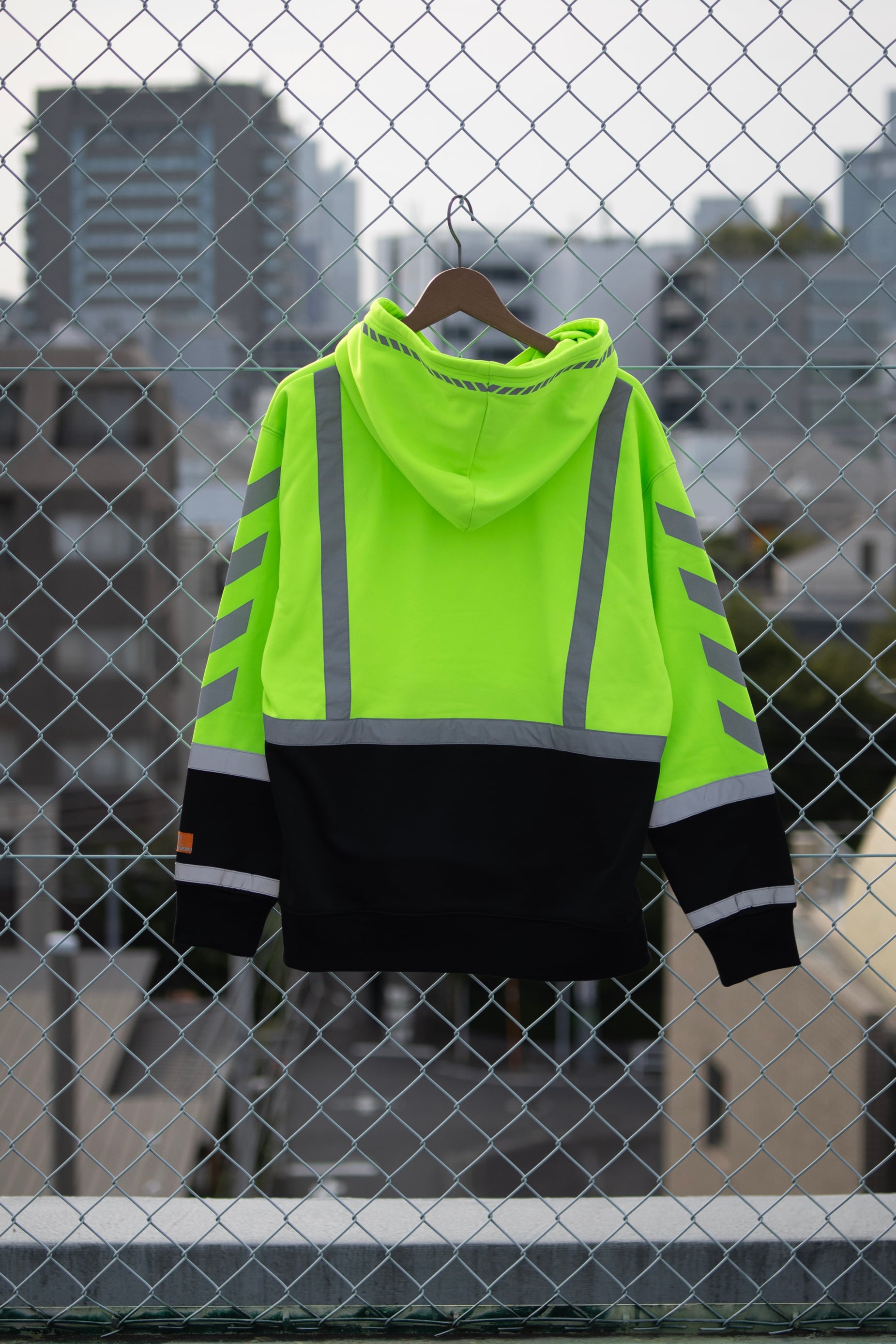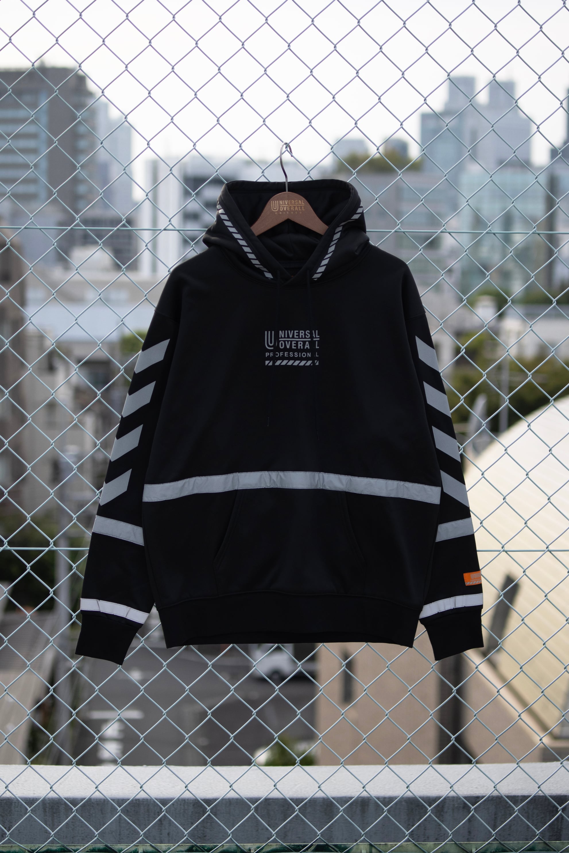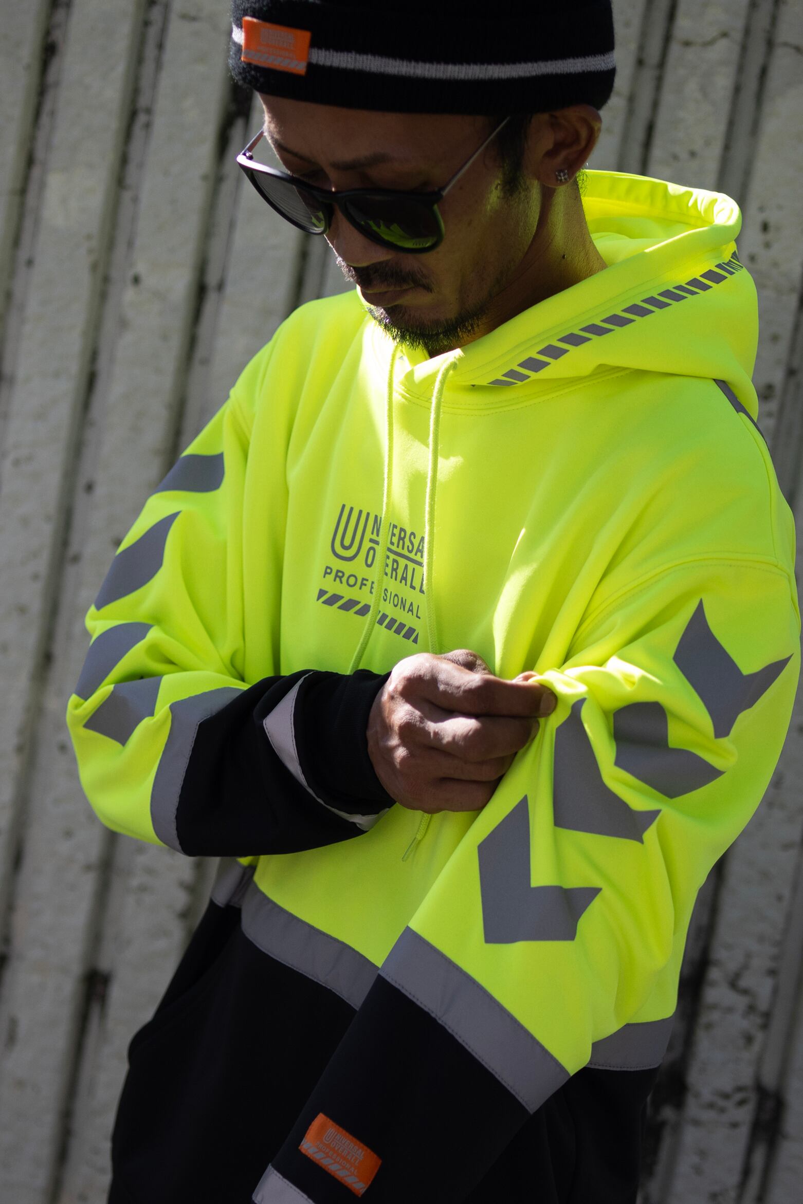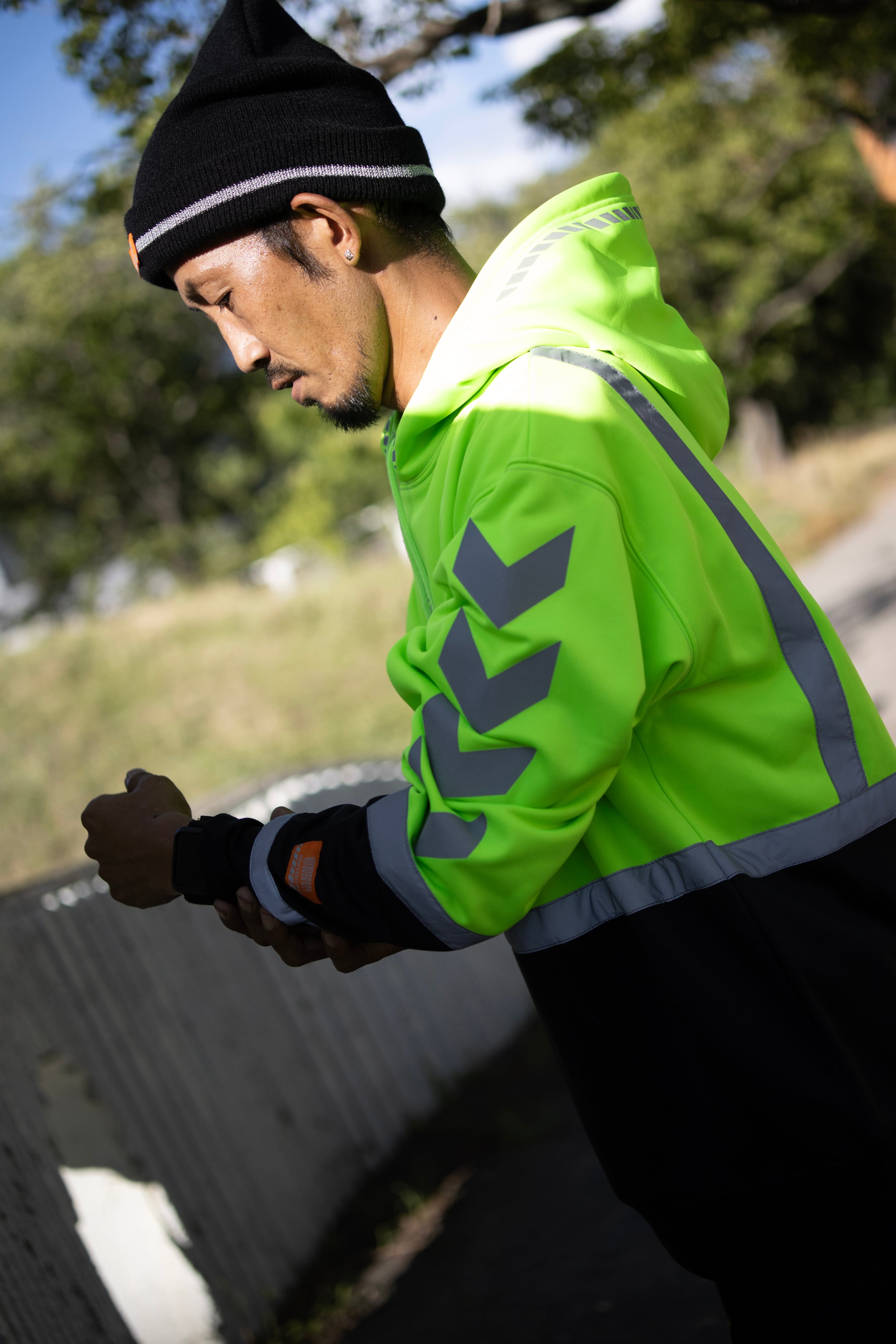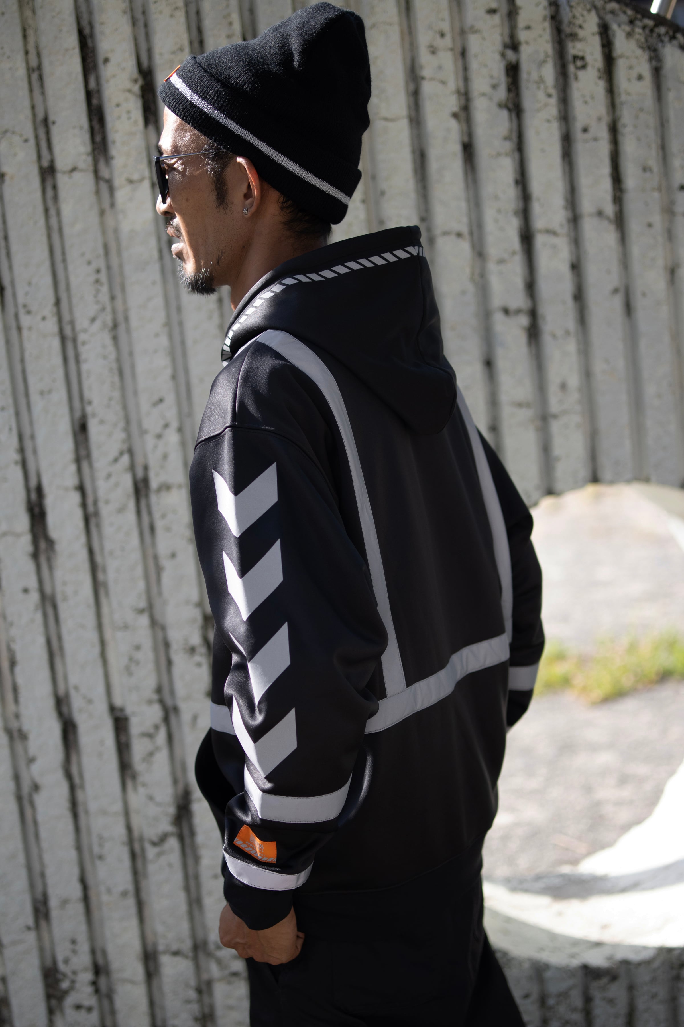 フード周りに施されたバリケード柄リフレクタープリント、両腕の矢印プリント、そして胸元のロゴまでもがリフレクター仕様。さらに中央・袖口・背面にはリフレクターテープを配置し、360度どの角度からも光を受ければ反射する高い視認性を実現しました。